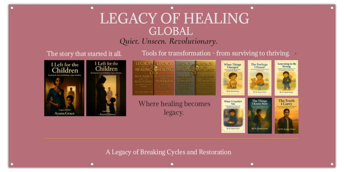 From the deeply personal memoir I Left for the Children — the foundation of the Legacy of Healing Global framework — to the expanding Legacy Series, including The Wounded and the Wounding, the SurThrivor’s Edition Workbook, the Teacher’s Edition, the Therapist Edition & Facilitator Guide, and the Legacy of Healing Children’s Series (ages 4–18) — each resource is designed to guide individuals and families through understanding, growth, and lasting change.